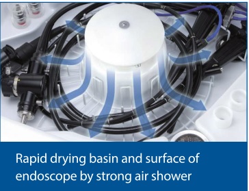 Rửa cùng lúc 02 ống soi, làm khô nhanh bồn rửa và bề mặt ống soi bằng hệ thống phun hơi mạnh mẽ